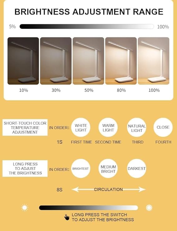 - Our LED desk lamp provides 3 lighting modes (Bright, Warm & Natural) and 10 adjustable brightness levels.